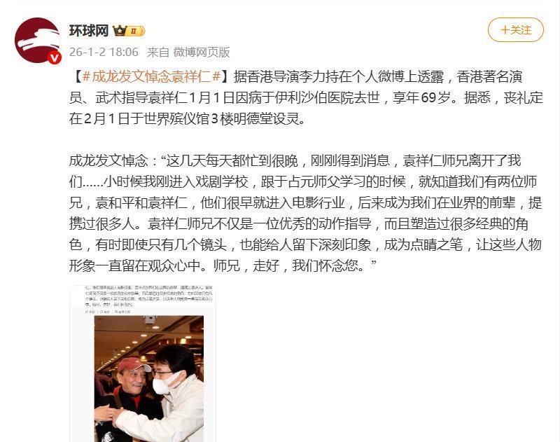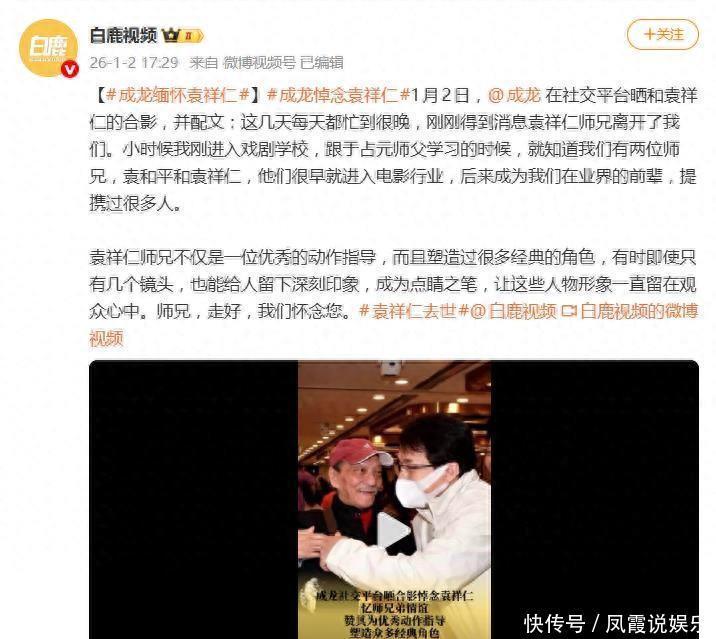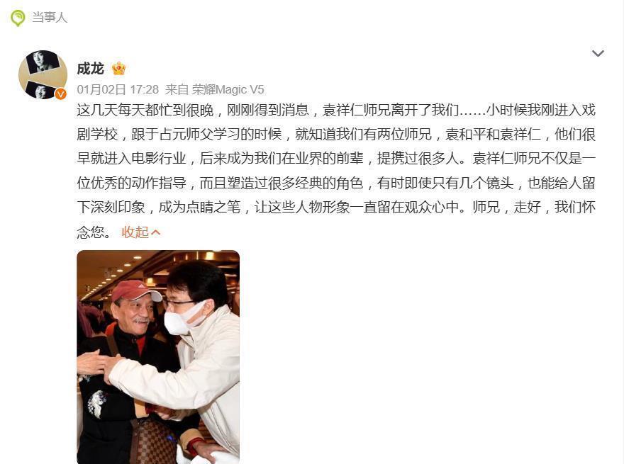 1月2日,成龙在社交平台的一则悼文,瞬间击中了无数影迷的心。他晒出与袁祥仁的合影,写下:“师兄,走好,我们怀念您。”这句看似简单的话,连同文中追忆的师门情谊与业界点滴,如同一个开关,开启了网友们对港片黄金时代汹涌的集体怀念。